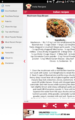 3. Recipe display: This screen shows the Recipe content, you can like/dislike, share Recipe data, add to your favorite list or even comment on the Recipe