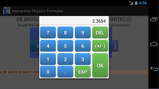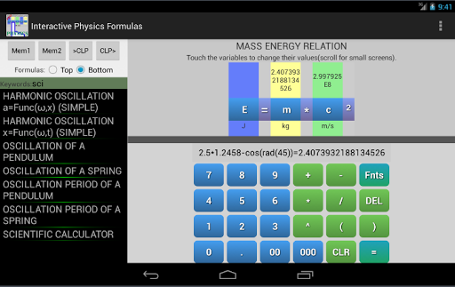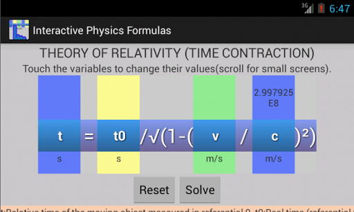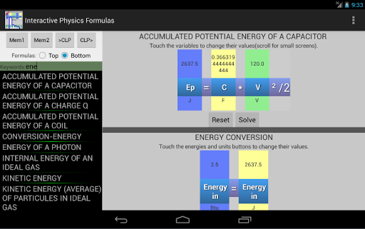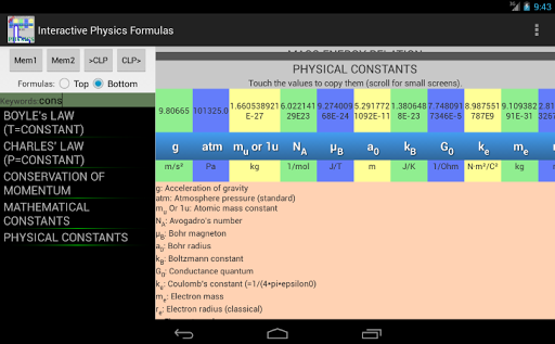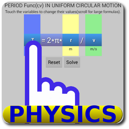 In this app there are more than 180 formulas covering various topics like: Newtonian mechanics, waves, electricity, relativity etc. The interface is made in a way that you can see above any variable it's value.