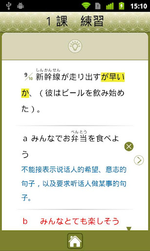 “目录”:将每个句型按照50音图顺序、课的顺序、自己学习过的项目顺序等排列归类,可以自行选择自己想学习的句型。