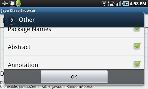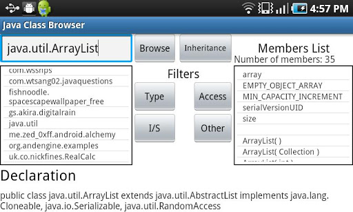 The Java Class Browser is a convenient utility that allows you to browse Java Classes within the installed packages on your Android device by entering their name. Find out what members a particular Class contains, and also it's inheritance hierarchy.