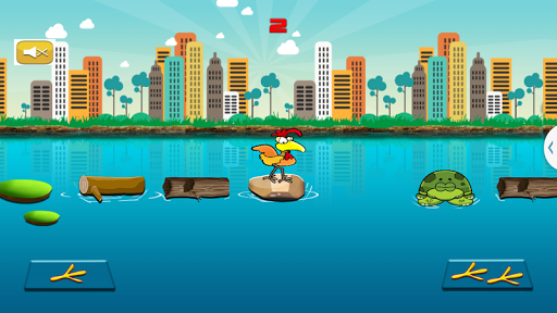 Tap the buttons so the Rooster can jump over the logs, rocks, sleeping snaks, and grumpy turtles to move forward. Try not to fall into the river. Also, be careful with the dog behind.
