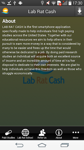 LAB RAT CASH is the first smartphone application specifically made to help individuals find high paying studies across the United States. Together with our educational resources we aim to help others in their pursuit to earn more money in a way that is considered by many to be easier and frees up the time that would otherwise be dedicated to a job. By doing paid research studies an individual will acquire both an excellent source of income and an incredible amount of time at his/her disposal to dedicate to their own interests. We are glad to help individuals achieve this freedom as well as those who struggle economically.