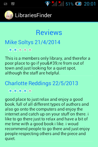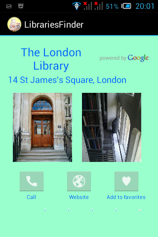 LibrariesFinder app allows you to find libraries, book stores and other structures to consult or buy a book near you. Once chosen a library, you can dial its number, visit its website and read the Google users reviews. Finally, you have also your favorites list to manage and to have at hand favorite libraries.