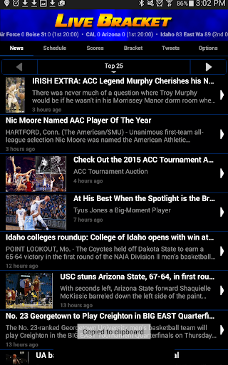 Live Bracket 2015 lets you create your own College Basketball Tournament Bracket with live scores in the app. Includes up to the minute Scores, Schedules, News and Tweets for all Div I conferences throughout the tournament.