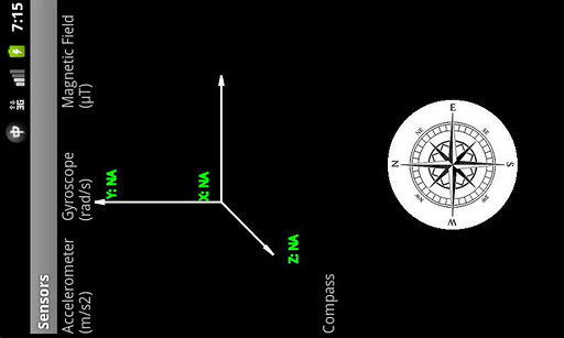 Compass with live value in 3D view of Accelerometer, Magnetic field meter, and Gyroscope meter.