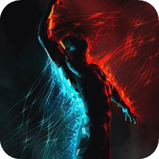 Man-robot frozen in the air. From his body red and blue glowing lines are streaming in different directions. Two elements - fire and water - are coming out of a fantastic creature.