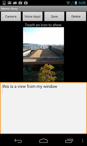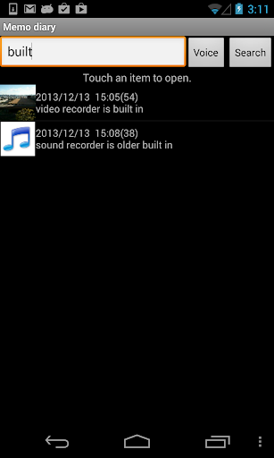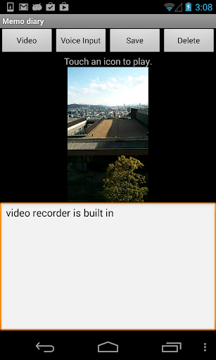Memo diary is designed to record your memo or memory using voice input, camera, video recorder, sound recorder and drawing. All recorded data will show up on the top screen timeline. Search function is available.