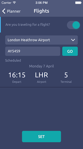 Tell mitime your travel plans and it will automatically set your alarm to alert you when you need to get going.