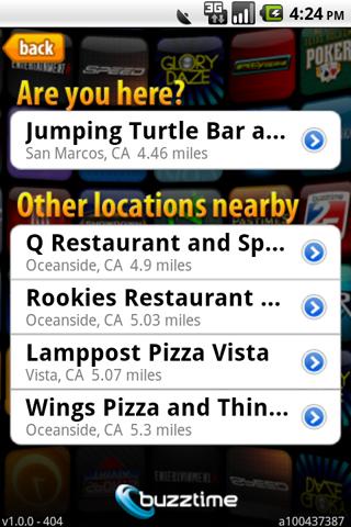• Find Buzztime locations near you: The Buzztime Mobile Playmaker uses your GPS location to provide you a list of the nearest Buzztime locations. Simply select the location that you’re in, or check out other locations in the neighborhood!