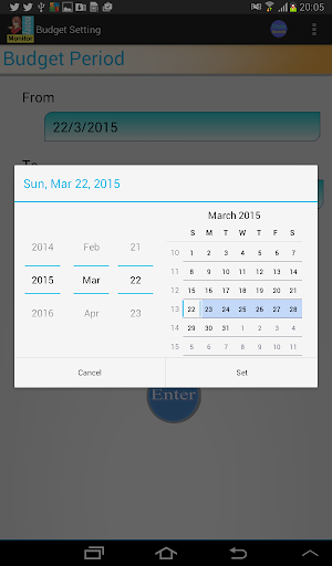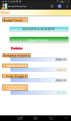 Firstly, you need to set up a budget period. Then, recording your daily expenditure. Money Monitor will calculate the total of your expenditure and shows you whether over budget or not.