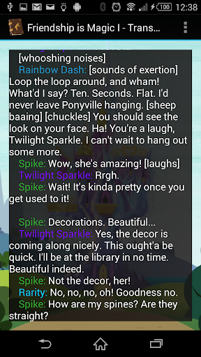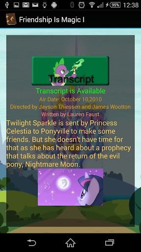 This Application contains All My Little Pony:Friendship is Magic Episode Transcripts with Description, writers and thumbnails. Over 100 Characters with different color inside the Transcript, including: Twilight Sparkle, Rainbow Dash, Fluttershy, Pinkie Pie, Rarity, Applejack, Princess Luna,.. and many more. The one and only app to guide you, through all Mlp episodes.