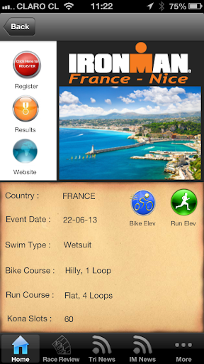 Application designed to help triathletes to pick their next race. View Race information, with bike and run elevation profiles. Check race results. Find latest news on Ironman events. Fill out a quick race review. Participate in discussion forum.