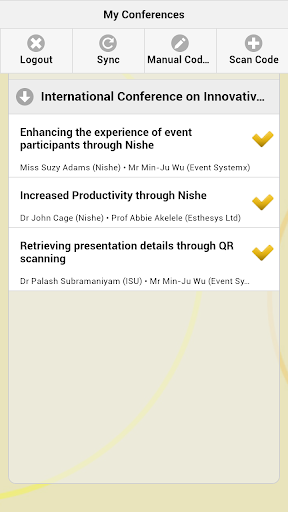 This app is part of the NISHE system for event participants. It is designed as a tool for participants to add presentation/exhibits of interest into their NISHE accounts via their mobile phones or tablets. Collected materials are recorded and displayed as a list within each event title. The app syncs the collected materials to the user's NISHE account if internet connection is available, otherwise, it stores the information and syncs it once internet connection has been established.