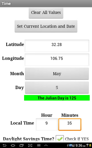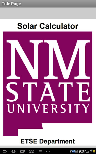 This android app created by the Engineering Technology Department in the College of Engineering at New Mexico State University (NMSU) is intended to be used as a guide through the process of calculating solar time, angles, and irradiation and aid in feasibility and implementation decisions of solar energy projects.