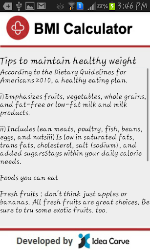 on an individual's mass and height. It can be used to find your healthy weight and it also gives you some tips to maintain healthy weight.Metric and imperial systems are supported.