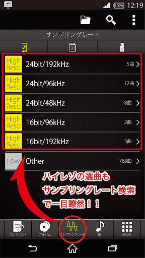・選曲時に素早くハイレゾ音源を探せるように曲、アルバム、アーティストだけではなく「サンプリングレート」と「フォーマット」でもリスト表示する事ができます。聴きたいハイレゾ音源が一目で分かるデザインでスムーズに選曲を行う事が出来ます。