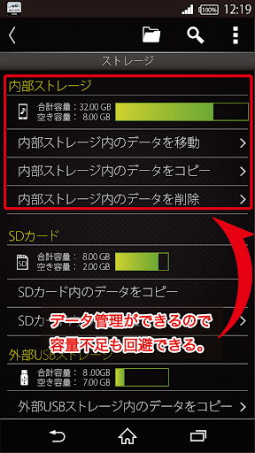 ・ストレージごとで独立した3つのライブラリー管理を行う事が出来ます。スマートフォン本体のメモリ、SDカード、外部USBストレージを独立して表示する事ができますのでデータの保存先を混同する事がありません。アプリケーション内でファイルのコピーや削除が出来るため、スマートフォン本体の容量不足も補う事ができます。