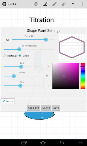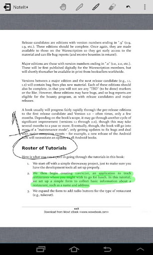 grid type for the notes. Notes can also be saved in pdf format. The app also allows sharing of notes via Bluetooth and other applications. Note IT + has an integrated pdf reader which allows notes to be made on any pdf file, and the annotated pdf can be converted to a note file for further sharing and backup.