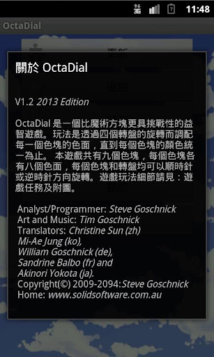 OctaDial 是一個比魔術方塊更具挑戰性的益智遊戲。玩法是透過四個轉盤的旋轉而調配每一個色塊的色面,直到每個色塊的顏色統一為止。