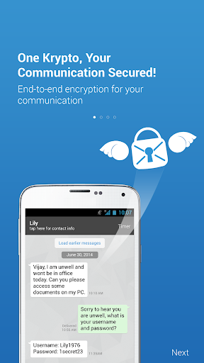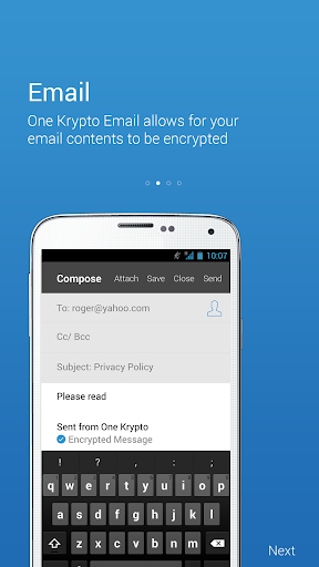 One Krypto application allows for communication via SMS, chat and email to be sent in an encrypted form; thereby ensuring a secure way for messages and information to be exchanged between devices.