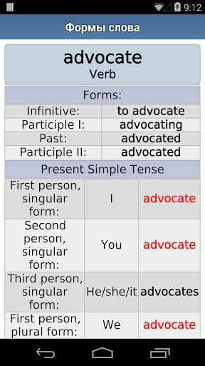 • Подробная грамматическая справка: таблицы времен глаголов, спряжения, склонения, формы множественного числа и многое другое.