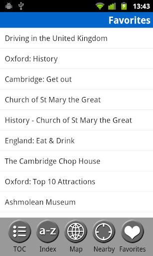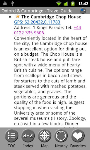 MobileReference Travel Guides provide detailed, practical information about attractions, landmarks, transportation, cultural venues, dining, lodging, history and much more. They are indexed alphabetically and by category, making it easier to access individual articles. Attractions can be viewed on an offline GPS map along with your current location so that you can easily find attractions near you as you explore the city.