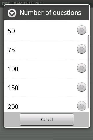 Choose how many questions you want to take at each time, or take the full 200 questions at a time. The database in the PRO version is feeding the application has over 500 questions loaded,