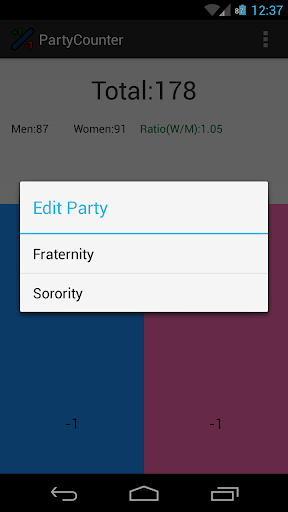 Party Counter allows hosts to easily keep track of total occupancy and gender ratios at parties. Manage your party better with the data collected by Party Counter.