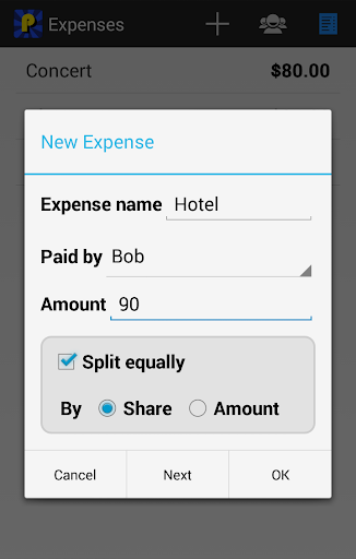 - Splitting options. The app allows you to split an expense equally by default, or customise by share or by amount. This allows you to exclude someone from the group for a particular expense if necessary.