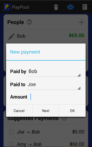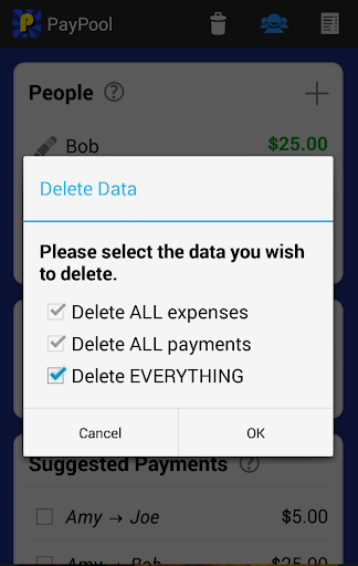 - Suggested payments. The app tells you the easiest way to split costs by suggesting who should pay who, and how much should be paid.