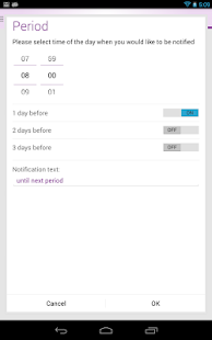 Disclaimer: Menstrual cycle, ovulation and fertility forecasts may not be accurate and should not be used to prevent unwanted pregnancy. To forecast ovulation Period Diary Calendar / Tracker calculates 14 days before the projected start date of one's next period. Forecast accuracy depends on a number of factors including how regular one's cycle length is, when one actually ovulates during the cycle, and how many periods have been logged in the app. Anxiety, stress, diet, nutrition, exercise, environment, medications, age and other factors can also affect one's cycle from month to month.