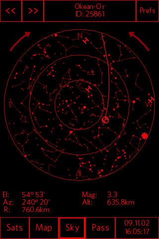 - Sky view shows satellite position and path in the sky, as well as current brightness. The Sun, Moon, stars and constellations can also be plotted.