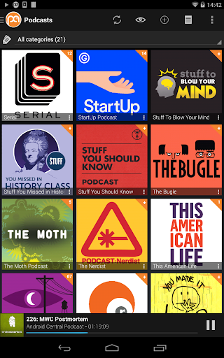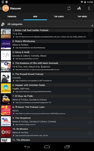 Subscribe to your favorite podcasts using the embedded networks (5by5, ABC, AfterBuzz TV, BBC, CNN, Carolla Digital, ESPN, FrogPants, LibriVox, Nerdist, NPR, Revision3, Smodcast, Ted Talks, Twit, NPO, ...).