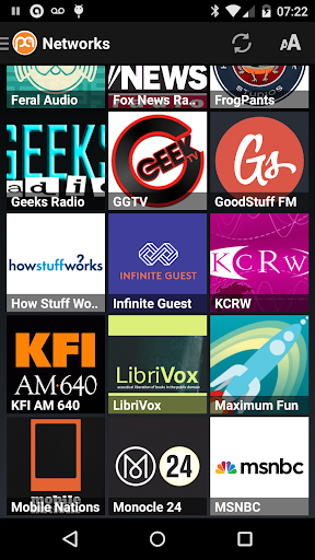 • English: 5by5, 77 WABC Radio, ABC, Absolute Radio, AfterBuzz TV, Al Jazeera, BBC, Carolla Digital, CBC, CBS Radio News, CBS Sport Radio, Channel 9 (MSDN), CNN, DVMPE, Earwolf, ESPN, Feral Audio, Fox News Radio, FrogPants, Gimlet Media, Goodstuff FM, How Stuff Works, Infinite Guest, KCRW, KFI AM 640, LibriVox, Mobile Nations, Monocle 24, MSNBC, Mule Radio Syndicate, NASA, Nerdist, Nickelodeon, NPR, Panoply, PBS, Podnutz, Public Radio International (PRI), Quick and Dirty Tips, Radiotopia, Relay FM, Revision3, RTÉ Radio, Scientific American, Slate, Smodcast, Stand Up NY Labs, The Guardian, The Incomparable, The Naked Scientists, Ted Talks, The Blaze, The New Yorker, Twit, Voice America, WBEZ 91.5, WFMU, WNYC, WOR 710, WWNO