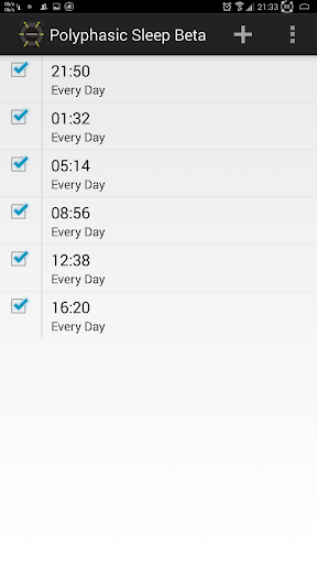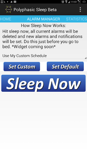 Companion app for polyphasic sleepers or those interested in polyphasic sleep, features an advanced automatic alarm scheduler that schedules all your alarms and sends notifications when you need to take a nap. Sleep tracking and statistics are planned features, currently the statistics are filled with dummy data, these will be added soon. Project is now open source see below for link to join this project and contribute.