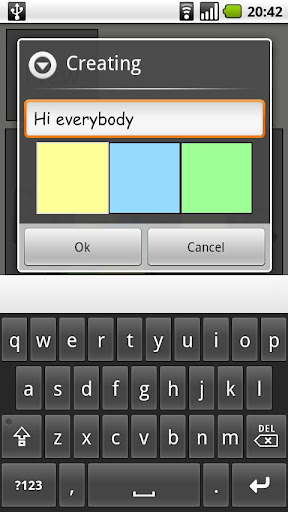 A: There is two way to do this. First, tap new rect and drag new note on to the notes desk, in appeared dialog enter note text, select note color and press ok button. Second, Long click notes desk and do the same.