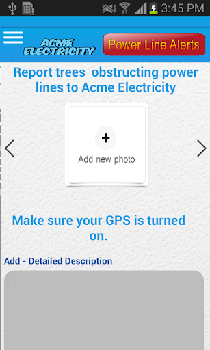 Power Line Alerts lets you report to electricity distributors instances where trees are dangerously close to power lines. The reports contain photos and the GPS location of the site. Help identify potential fire hazards.