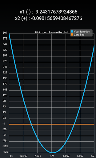 The app wil determine whether there are intersections of the quadratic equation you enterede with the X-axis and if they exists, it will give you the points of the intersections. Furthermore, the app will show a plot of the quaratic equation you entered around the points of intersection with the X-axis to provide more insight. Note that the plot is interactive and can be scrolled by dragging and zoomend by pinching!