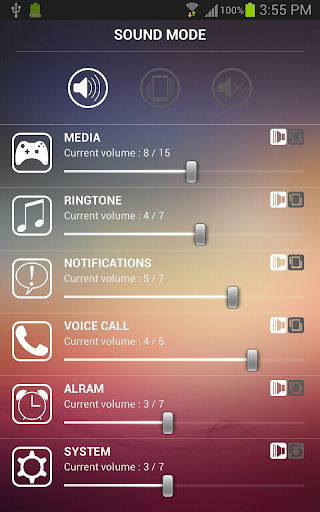 - This is a volume control application for adjusting Ringer, Notification, Media, Voice, System, and Alarm, also to switch between Silent, Vibrate and Normal.