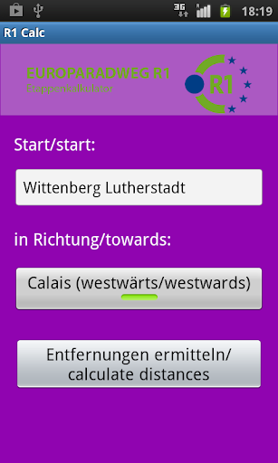 "R1 Calc 2.0" is an app for determining the distance between towns along the bicyclepath EUROROUTE R1 (Europaradweg R1) from the French Calais to St. Petersburg in Russian (3,800 km).