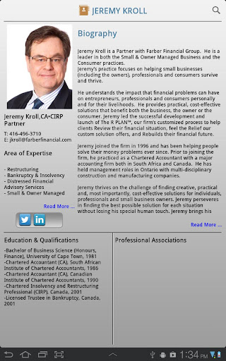 You will find contact information and biographies on all the Trustees in Bankruptcy and other professionals at Farber. Drop us a line. Let us know if you are using and enjoying the app. Farber – Responsive. Practical. Results.
