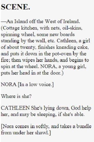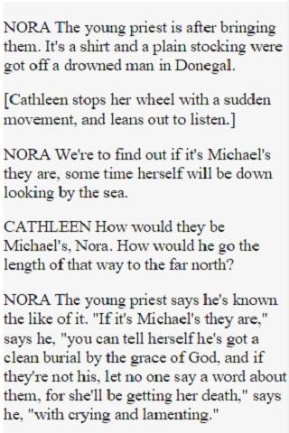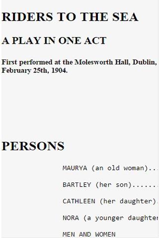 The other element in the story which Synge introduces into the play is equally true. Many tales of "second sight" are to be heard among Celtic races. In fact, they are so common as to arouse little or no wonder in the minds of the people. It is just such a tale, which there seems no valid reason for doubting, that Synge heard, and that gave the title, "Riders to the Sea", to his play.