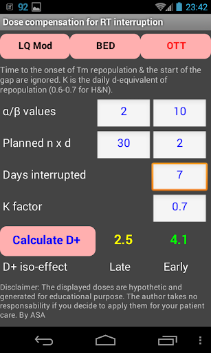 - The BED (Biologically Effective Dose) calculation for 1 or 2 RT schedules simultaneously.
