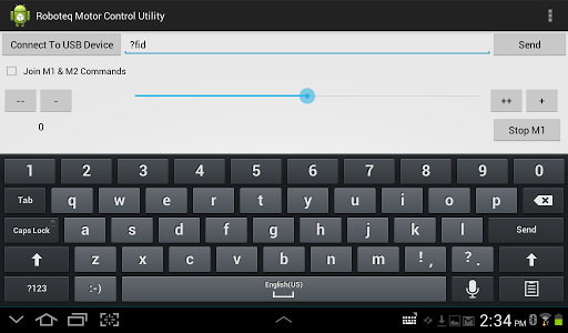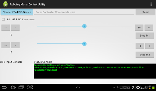 This is an Android powered motor control utility for the RoboteQ MDC2250C motor controller. Connect your Android device to the MDC2250C USB port. Provides a subset of features found in the RoboRun Utility including: