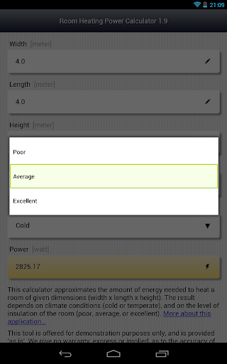 This calculator approximates the amount of energy needed to heat a room of given dimensions (width x length x height). The result depends on climate conditions (cold or temperate), and on the level of insulation of the room (poor, average, or excellent). More about this application: http://labaix.com/r/?p=com.labaix.roomheatpowcalc