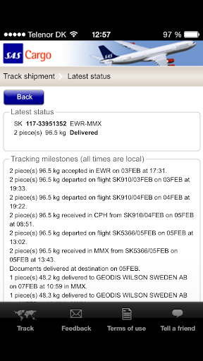 Get the latest status of your SAS Cargo shipments when you need it. SAS Cargo tracking app allows you to track your air freight shipments on your mobile phone or tablet.