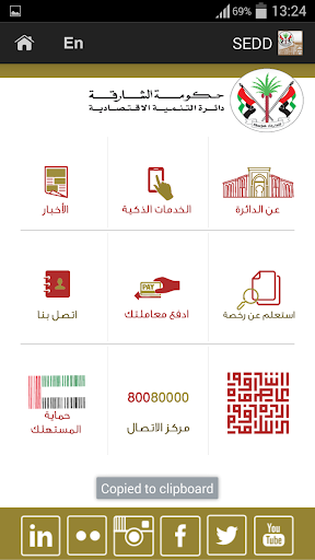 Welcome to Sharjah Economic Development Smart App. This Application hosts more than 25 services which target Investors, Government and Consumers in the Emirate of Sharjah, it also provides information about the department and its contact information.