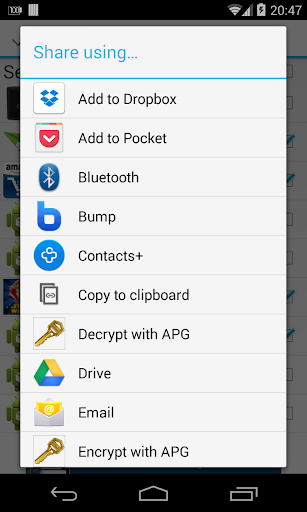 - Allows you to share your apps information (for now app name, package name and installation link) with your friends through SMS, GMail, etc.