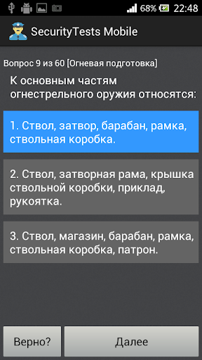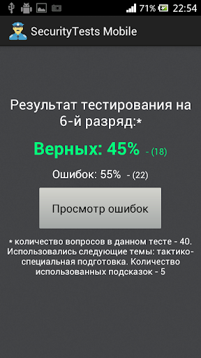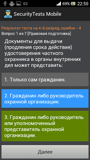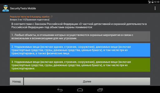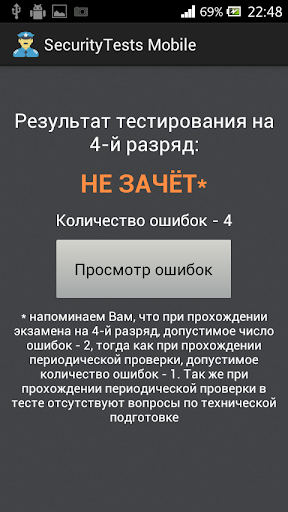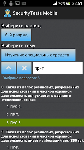 Назначение программы - подготовка частных охранников 4, 5 и 6 разряда к тестированию и сдаче квалификационного экзамена. Программа позволяет пройти тестирование по актуальному на данный момент списку из 330 вопросов. Тестирование разбито по разрядам и темам.