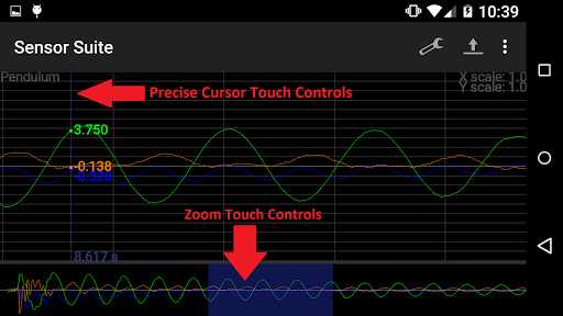 An advanced graphing system provides a powerful data visualization tool to inspect parts of a graph or view exact measured values. On the lower graph view, touch controls and pinch gestures allow panning or zooming. On the top graph, touching or dragging controls a cursor that can be used to get the values of all sensor at any point time.